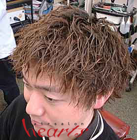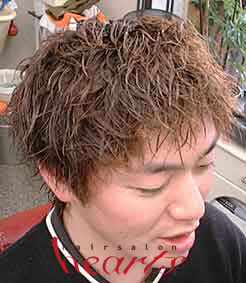 前から見た感じです。このヘアーはツイストパーマを全体に施してあり、今、旬なスタイルでイメージチェンジをするにはもってこいのスタイルです。斜め横から見た感じです。カットは全体にランダムな軽さを出すようにしてあります、カラーはゴールド系の9トーン位にしてあります。セットは、パーマとカットがそのまま形になっていますので、乾かすか、半乾きの所にワックスをつけてクシャクシャな感じを出しましょう!