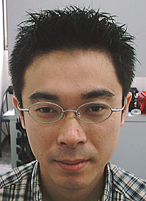 正面からの感じはこんな感じで、まわりの刈り上げはいわゆる「切ったばかりの刈り上げ」でなく「2週間くらいたった刈り上げ」という事でギザギザに刈り上げてゆきます。後ろからの感じを見てもらえばわかる通り、後ろもギザギザに刈り上げてあります。上の方はセットをしやすくするために、中間根元と大きくすいていきますが、髪質や立ち上がりを考えながら調節してゆきます。セットは、カットがそのまま形になっていますので、ワックスやジェルをつけてクシャクシャに立てるだけ。会社や学校などでツンツンしているのがダメな場合はクシなどで寝かしつければ大丈夫です! |
