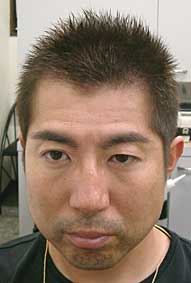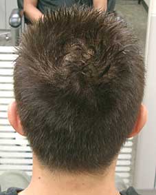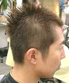 不揃い感のあるボウズヘアにつむじの所にワンポイントを置く事により、正面からはややソフトモヒカンぎみに見え、サイドはアゴからつむじに向かって風が吹き上がって、たなびいたようなイメージの立ち上がりにする事で、ダイナミック&おしゃれにインパクトのあるヘアスタイルになります。ヘアカラーは6トーンくらいに押さえる事により、若すぎるヘアとは差をつけます。もちろん、もっと若く見せるのならば8〜9トーン以上にする方が良いでしょう。