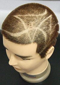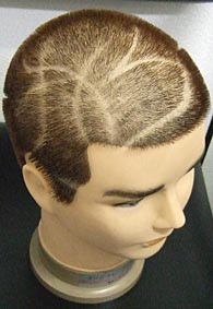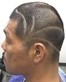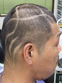 全体に5mmで丸刈りにした後、色々なラインを入れます。ラインについては、手書きでデザインをして来て頂いても構いませんし、こちらでご相談に乗る事も出来ます。こちらのお客様はご自分でお考えになったラインを入れてあります。人形の方は、デザインというよりも、こんなラインが色々とありますよ!という例としてお考え下さい。
