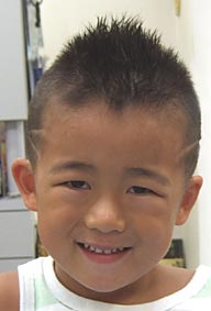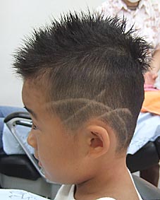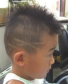 幼稚園生のソフトモヒカンです。実際には子供の髪というのは立毛筋が育っていませんので、自然に立ち上がるというのは難しく、頭なりに寝てしまいます。よって、お父さん&お母さんのセット能力に頼る部分が強いです・・(^-^;(笑)ラインに関しましては、ご両親のご要望があれば、お好きなデザインで入れます。ただ、大人と違って、キャンパスとなる範囲が狭いので細かい柄ですと目立ちにくいので、その辺を考えて頂いたラインでしたらきれいに入りますよ!じっとじていられるならばレザーアートも可能です!(^^*)