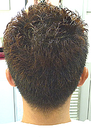 アイロンで全体に本当にゆるいボディパーマを施し、徹底的に毛束を意識して毛量調節を行います。まわりはきっちり刈り上げず、パーマの部分で出来上がった空気感を壊さないように刈上自体も、カットして何日か経ったような自然さを表現すべく丁寧にカットして行きます。当店は水をつけてこのような状態がきちんとセットできる事を確認しますので安心です。