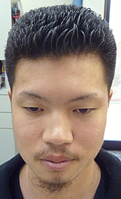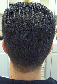 いわゆる「パンチパーマ」です。髪の多い方なので軽さを出していますので、大昔のようなゴツゴツした「パンチパーマ」でなく、強いカールの中にも上品な感じに優しくフワッとした感じを出しています。こういうパーマに自然な刈上は合わないので、しっかりとしたグラデーションの刈上を入れています。