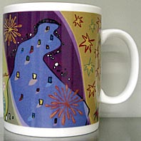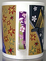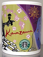Yさんのお陰で手に入れた「金沢限定マグ」!兼六園の石畳の上に舞い散るサクラと、金沢の町並み(武家屋敷の石畳か?)、 浅野川の加賀友禅灯ろう流し、冬の雪吊りの唐崎松など「金沢の四季」がデザインされてます。