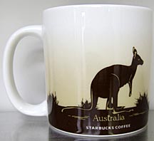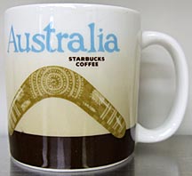 友人に買ってきてもらったオーストラリアマグ。「ブーメランと言えばオーストラリア」、「オーストラリアと言えばブーメラン」だそうで、オーストラリアでは有名な【アボリジナルブーメラン】が描かれています。後ろはカンガルー。耳の立ち方からするとレッド・カンガルーでしょうかね?グレー・カンガルーは耳が短いのでね・・。