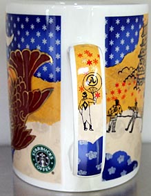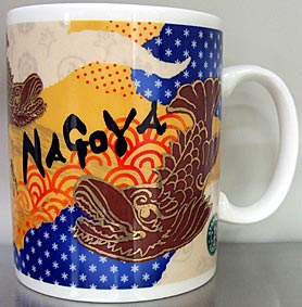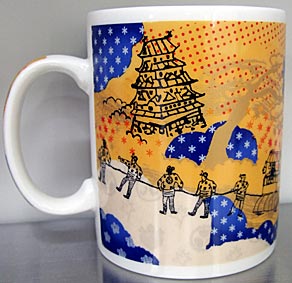 友人に買ってきてもらった名古屋マグの2nd。1st同様、メインはシャチホコ!全体にコラージュっぽい手法を使って描かれています。行列は現代の【名古屋祭り】のメインとなる郷土英傑行列を意味しているのか?名古屋城&白いのぼりを見るからには徳川家康の【関ヶ原の合戦】を意味しているのか?取っ手のおおきなうちわを持っている人がポイントなんでしょうけど、すみません・・わかりません・・(^-^;わかる方がいましたら教えて下さい。m(._.)m