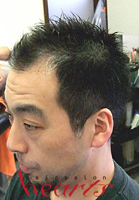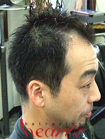 40代の方です。前髪がM字に薄くなる方というのは、実は男性には多く見受けられるパターンです。実際には正直このパターンの方は髪型の種類が非常に少ないのが現状です。方法として、大きく2つの方法に分けられます。ひとつは思い切ってショートに切り込んでいく、もうひとつは長くして前髪で隠すという方法です。中途半端だとM字ラインが強調されてしまいますので、今回は若く見えるベリーショートの提案です。そこで、坊主っぽいベースに少しアクセントをつけ、決して坊主ではない、実は髪型には気を遣っているぞ!という主張をしっかり表現します。同時に耳周りは自然さを出しながらもきれいにし清潔感を忘れないようにします。今風の要素をきちんと入れながらも大人としての姿勢も忘れない髪型なのです。