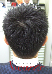 今回は軽いくせ毛の方を長めの坊主(自毛版)としてより自然に柔らかく作り上げました。社会人として過激さを抑えた上で、清潔感が漂い年齢も少し若くなるスタイルです。実際には長い毛をどれだけ作るか?に自然さというのは左右されてしまいます。よって、短くなればなるほどキッチリと整ってきてしまうという事になります。また、堅い髪の方は、アイロンやコールドパーマなどでゆるく全体にボディパーマが必要です。