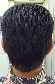 このスタイルはベーシックなリーゼントですが、毛先をほんの少しだけアイロンでカールを入れる事により、形状記憶毛髪のようになり、セットが非常に楽になるアイロンパーマです。細かい櫛目の櫛を通せば、アイパーのようにストレート表現も出来、こうした粗目の櫛を通せば、緩いパーマの表現も出来る、その日の気分で使い分けられます。